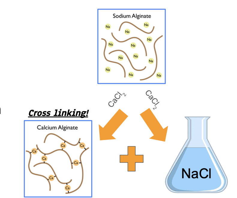 Why does calcium chloride cause alginate chains to crosslink into a gel?