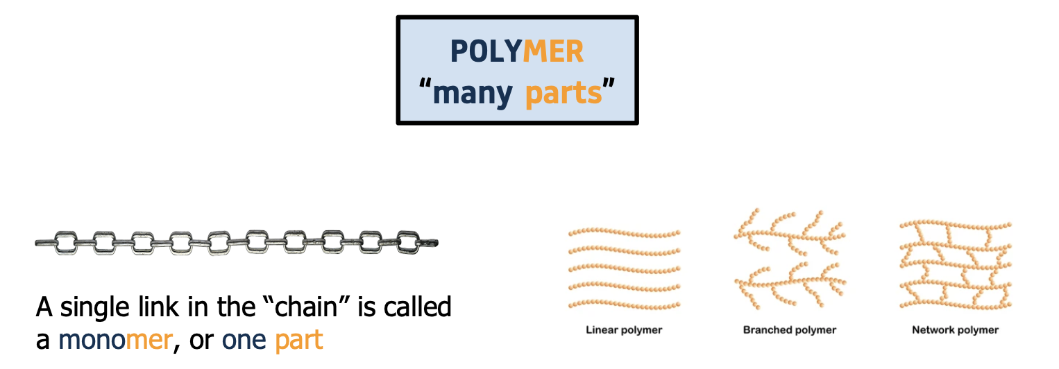 A polymer is a material made of many repeating molecular “links” (monomers) bonded into long chains or networks.